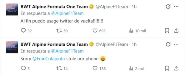 Por unos instantes, el piloto argentino pareció haberse “adueñado” de la cuenta del equipo francés y escribió: “Al fin puedo usar Twitter de vuelta”, mensaje que sorprendió a los seguidores de la escudería. Sin embargo, pocos segundos después llegó una aclaración desde la misma cuenta: “Lo siento, Colapinto nos robó el teléfono”, en un posteo que confirmó el tono humorístico de la situación.