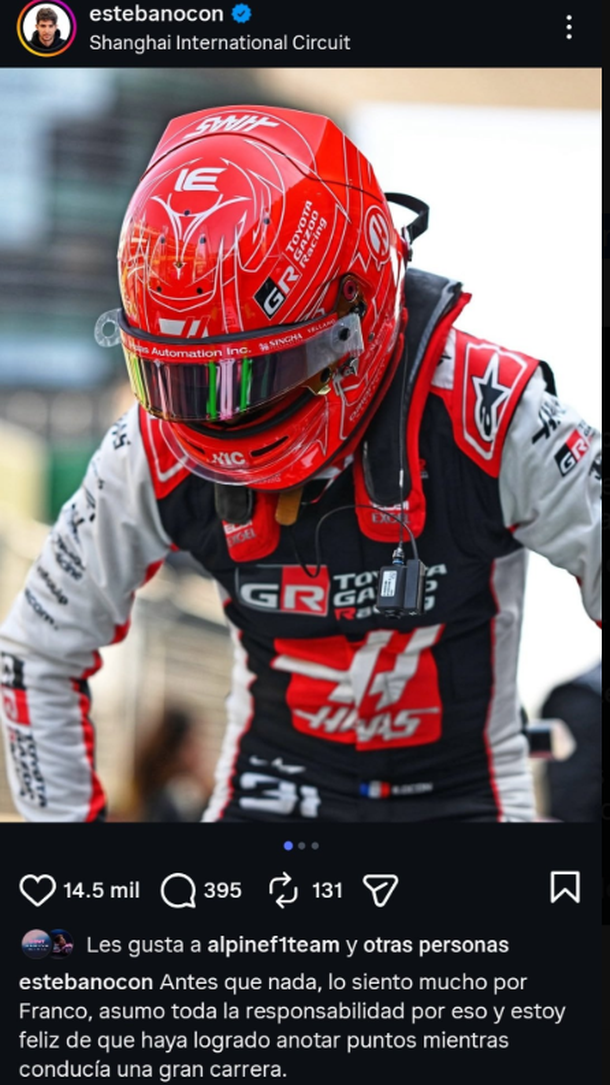 Franco Colapinto tuvo un arranque brillante en el Gran Premio de China de Fórmula 1 tras largar 12º y escalar rápidamente hasta el 6º puesto. Sin embargo, cuando la carrera transitaba la vuelta 34, un choque desde atrás de Esteban Ocon tras la salida de boxes complicó seriamente su carrera. El pedido de disculpas Esteban […]