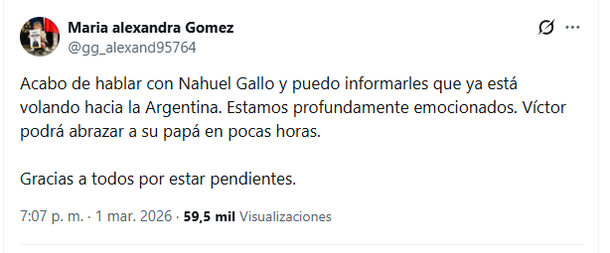 El conmovedor mensaje de la esposa de Nahuel Gallo: «Ya está volando a la Argentina»