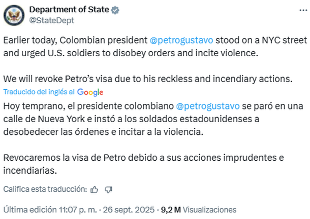 El Departamento de Estado de los Estados Unidos decidió revocar la visa del presidente de Colombia, Gustavo Petro, argumentando «acciones imprudentes e incendiarias» por parte del mandatario colombiano durante una manifestación callejera en Nueva York. Petro se encontraba en esa ciudad para participar de la Asamblea General de la Organización de las Naciones Unidas (ONU), […]