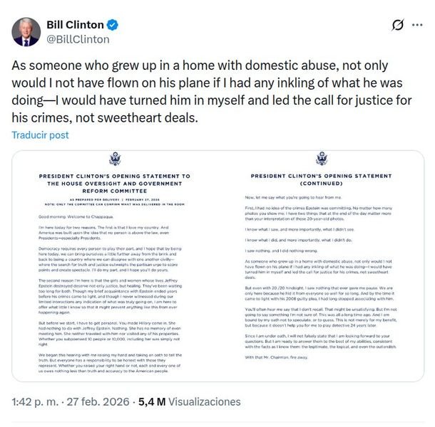 El expresidente de los Estados Unidos Bill Clinton y su mujer, Hillary Rodham Clinton, declararon esta semana ante miembros de la Cámara de Representantes en referencia a su relación con el financista Jeffrey Epstein, que murió en una cárcel de Nueva York mientra era investigado por trata de personas y abuso sexual. Tras haber pedido […]