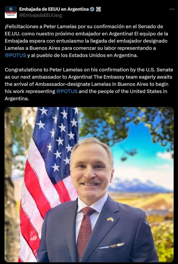 Luego de la designación realizada por el presidente Donald Trump, el Senado de los Estados Unidos confirmó a Peter Lamelas como nuevo embajador en la Argentina. «¡Felicitaciones a Peter Lamelas por su confirmación en el Senado de EE.UU. como nuestro próximo embajador en Argentina! El equipo de la Embajada espera con entusiasmo la llegada del […]