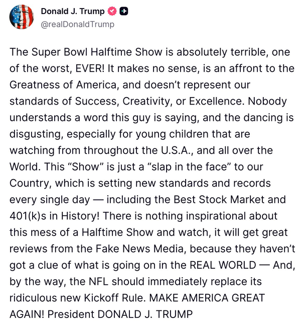 Donald Trump calificó de «repugnante» el show de Bad Bunny en el Super Bowl: «Nadie entiende ni una palabra»