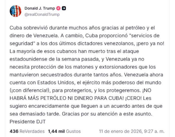 El presidente de Estados Unidos, Donald Trump, lanzó una dura advertencia al gobierno de Cuba, en la que anunció que la isla ya no recibirá más petróleo ni dinero provenientes de Venezuela y la instó a «llegar a un acuerdo antes de que sea demasiado tarde». A través de su plataforma Truth Social, el mandatario […]