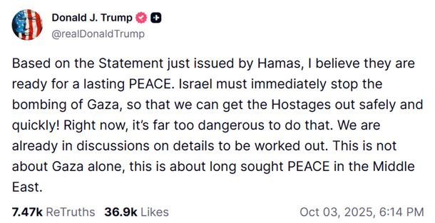 Donald Trump anunció la suspensión de los ataques israelíes sobre Gaza y pidió a Hamas «actuar rápidamente»