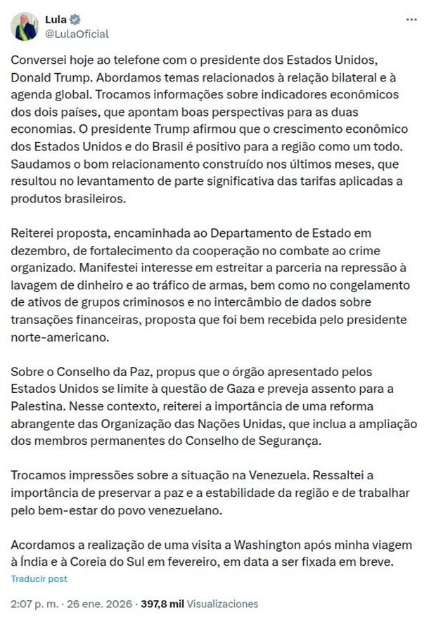 El presidente de Brasil, Luiz Inácio Lula da Silva, reveló este lunes el contenido de su conversación telefónica más reciente con su par de los Estados Unidos, Donald Trump, y anticipó que habrá una reunión entre ambos mandatarios en Washington DC. «Conversé por teléfono con el presidente de los Estados Unidos, Donald Trump. Abordamos temas […]