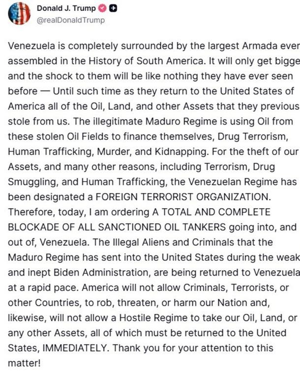 El presidente de los Estados Unidos, Donald Trump, ordenó el bloqueo “total y completo” de todos los buques petroleros sancionados que ingresen o salgan de Venezuela y acusó a Nicolás Maduro de haberle robado petróleo, tierras y otros activos. «Hoy ordeno un bloqueo total y completo de todos los petroleros sancionados que entren y salgan […]