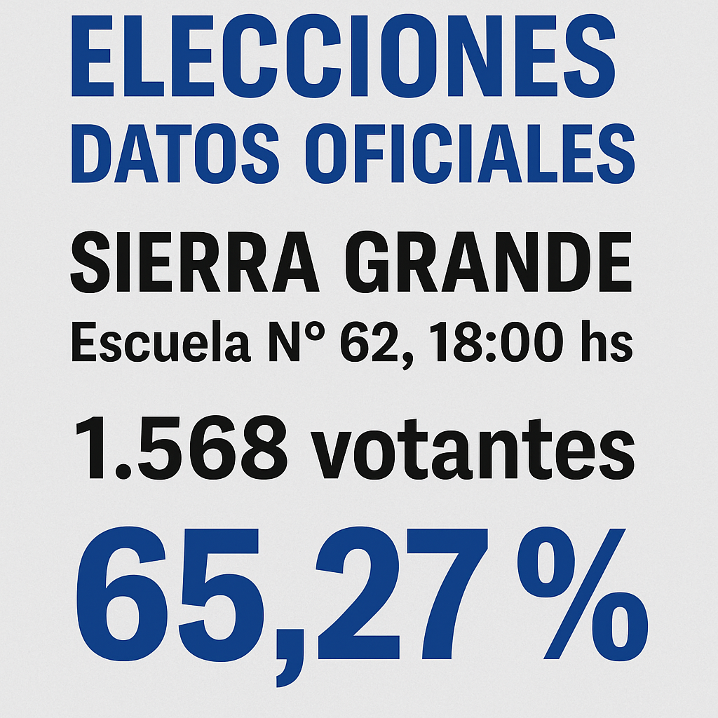 A las 18:00 hs, en la Escuela N.º 62 de Sierra Grande, se registró una participación total del 65,27 % del padrón electoral, con 1.568 votantes que emitieron su sufragio en todas las mesas habilitadas. El cierre de la jornada se desarrolló con total normalidad y una constante afluencia de vecinos durante la tarde. Las […]