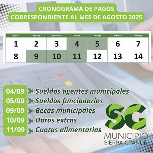 Cronograma de pagos: Sueldos Agentes Municipales 04/09 Sueldos Funcionarios 05/09 Becas 09/09 Horas Extras 10/09 Cuotas Alimentarias 11/09