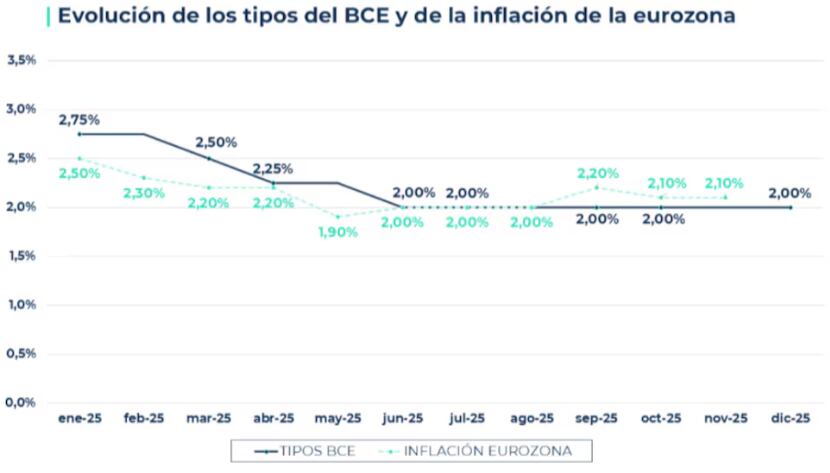 “Con una inflación controlada, un mercado laboral sólido e incentivos fiscales para reactivar la economía, el BCE se encuentra cómodo con el nivel actual de tipos de interés”, señalan los analistas de Bankinter, y no prevén recortes de tasas en 2026 por parte del supervisor.