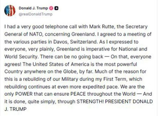 Y reiteró su postura: “Como les expresé a todos con total claridad, Groenlandia es fundamental para la seguridad nacional y mundial. No hay vuelta atrás. ¡En eso todos estamos de acuerdo! Estados Unidos es, con diferencia, el país más poderoso del mundo. Gran parte de esto se debe a la reconstrucción de nuestras Fuerzas Armadas durante mi primer mandato, reconstrucción que continúa a un ritmo aún más acelerado. Somos la única potencia que puede garantizar la paz en todo el mundo, y se logra, sencillamente, ¡con fuerza!”.