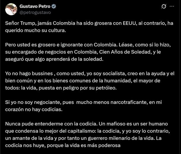 En un segundo posteo, el jefe de Estado colombiano dijo: «Señor Trump, jamás Colombia ha sido grosera con Estados Unidos. Pero usted es grosero e ignorante con Colombia. Léase ‘Cien años de soledad’ y algo aprenderá de la soledad. Yo no hago business, soy socialista, creo en el bien común. Un mafioso condensa lo peor del capitalismo: la codicia. Yo soy lo contrario, un amante de la vida».
