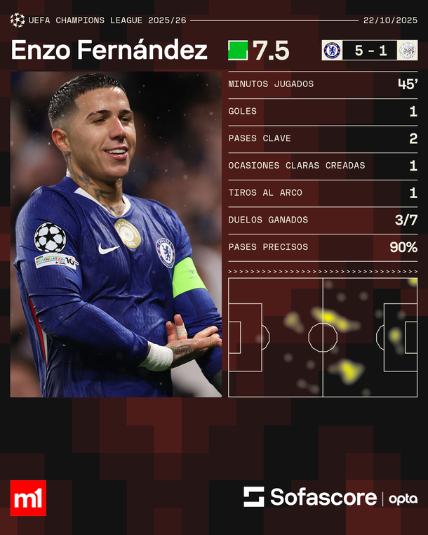 Los números de Enzo Fernández en el triunfo de Chelsea ante Ajax por la tercera fecha de la Champions League 45 minutos jugados un gol (de penal) 2 pases claves una ocasión clave creada 1 tiro al arco 3/7 duelos ganados 90% de pases precisos