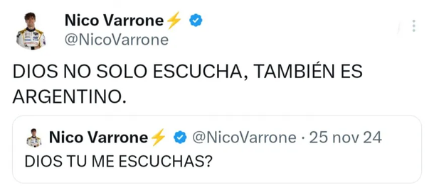 En medio de la explosión que generó la irrupción de Franco Colapinto en la Fórmula 1, Nicolás Varrone volvió a encender las especulaciones sobre su futuro automovilístico con un llamativo posteo en sus redes sociales, que generó alta expectativa entre los fanáticos por la contundencia de sus palabras.
