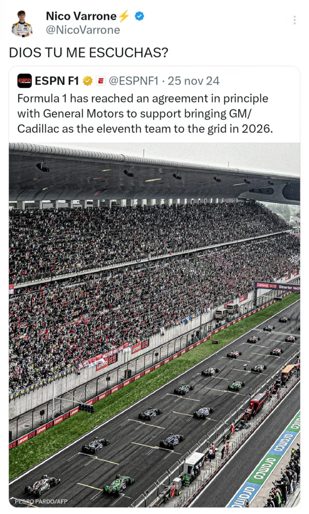 El contexto no es menor: Varrone ya había mostrado interés en formar parte del proyecto de Cadillac desde su anuncio en noviembre del año pasado, cuando escribió “Dios, ¿tú me escuchas?” al conocerse la llegada de la firma norteamericana al Mundial de F1. El reciente mensaje, aludiendo a aquella publicación, parece insinuar que podría haber novedades o acercamientos entre las partes.