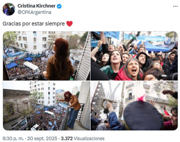 El posteo de Cristina Kirchner en plena movilización de sus seguidores: «Gracias por…»