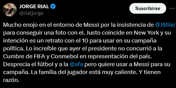 El periodista Jorge Rial, en su cuenta de X, sostuvo que “hay mucho enojo en el entorno de Messi por la presión de Milei”, y recordó que, paradójicamente, el mandatario no participó en la cumbre conjunta entre FIFA y Conmebol celebrada en la misma ciudad.