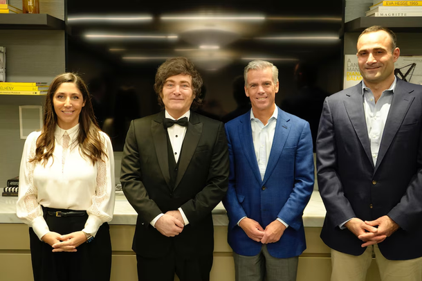 Minutos antes de la ceremonia, Milei mantuvo encuentros con altos ejecutivos, entre ellos Michael P. Lyons (CEO de Fiserv), Matthew Dell Orfano (Discovery Capital) y Soledad Cedro (CEO de CPAC Argentina).