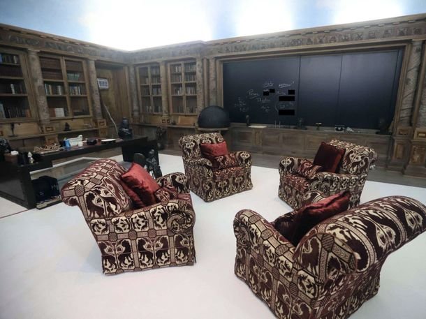 También se observa lo que parece ser una silla de dentista en una habitación adornada con máscaras de rostros de hombres calvos colgados en todas las paredes.