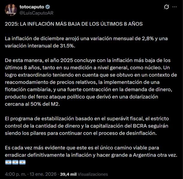 Tras conocerse que el índice mensual fue del 2,8%, mientras que la variación interanual alcanzó el 31,5%, el ministro Luis Caputo celebró el dato de inflación de diciembre con un mensaje publicado en sus redes sociales, en el que aseguró que 2025 cerró con la inflación más baja de los últimos ocho años.