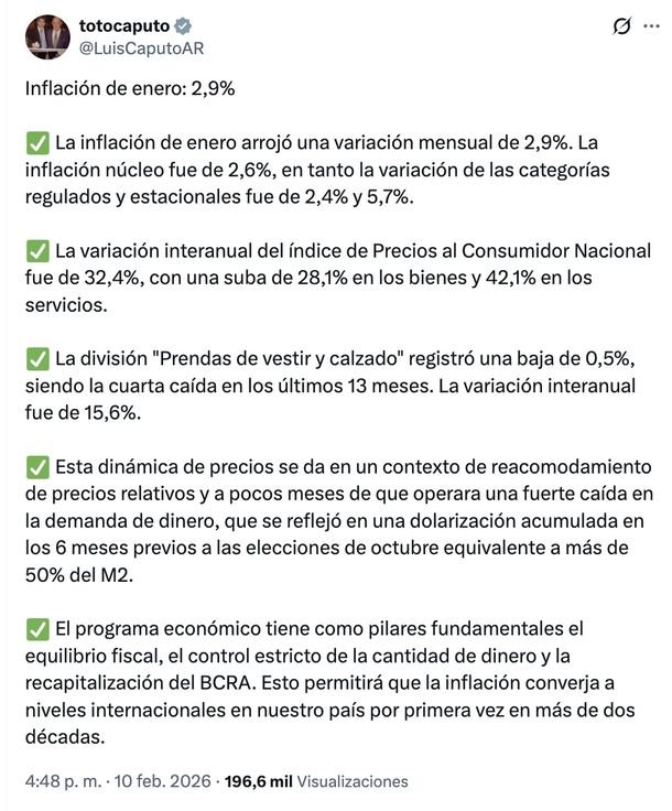 Tras la semana polémica del INDEC y el preocupante dato del 2,9% de inflación de enero, el ministro Luis Caputo analizó este martes los datos oficiales del Índice de Precios al Consumidor (IPC), argumentando que el proceso actual es parte de una transición necesaria tras la inestabilidad del año pasado.