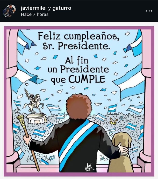 A la publicación se le sumó una caricatura muy particular: la imagen de Milei de espaldas, portando la banda presidencial, sosteniendo con el bastón con su mano izquierda y acariciando con la derecha a su perro Conan, mientras desde el balcón de la Casa Rosada mira a una Plaza de Mayo repleta de banderas argentinas.