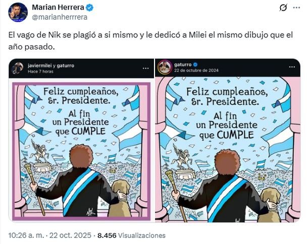 El presidente Javier Milei cumple 55 años este 22 de octubre y desde temprano recibió un sinfín de saludos y felicitaciones, entre ellos se destacó el de su amigo Nik, el creador de Gaturro, quien fue uno de los primeros en dedicarle una publicación en redes sociales. Sin embargo, un pequeño detalle no pasó desapercibido.