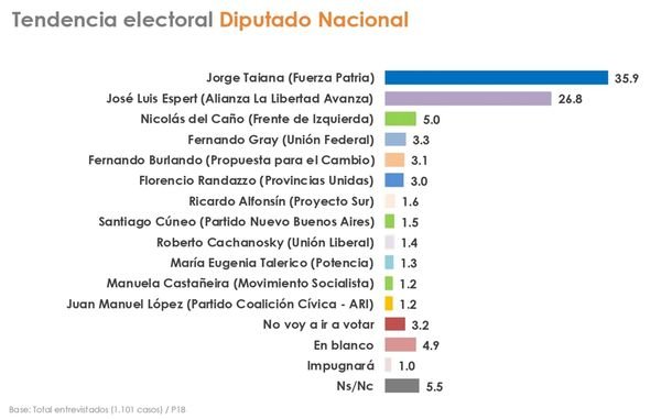 La muestra ratifica la supremacía electoral del peronismo, que lleva a Jorge Taiana como primer candidato a diputado nacional de Fuerza Patria (FP), mientras el principal candidato de La Libertad Avanza (LLA), José Luis Espert, queda en un cómodo y lejano segundo lugar.