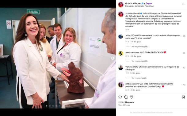 «Visita al Campus de Pilar de la Universidad del Salvador para dar una charla sobre mi experiencia personal en la política», escribió Victoria Villarruel el martes de esta semana, mientras Javier Milei se sacaba fotos en Nueva York con los pulgares para arriba, parado al lado del presidente de los Estados Unidos, Donald Trump, que le regaló una carpeta con su mensaje de Truth Social impreso.