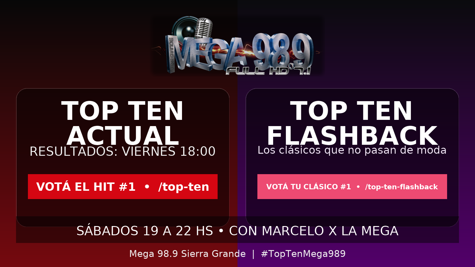 Votá tus canciones favoritas de la semana y los clásicos que no pasan de moda. Tu voto suma en tiempo real. Resultados: viernes 18:00. Recuento final y estreno del #1, sábados de 19 a 22 con Marcelo por La Mega 98.9.