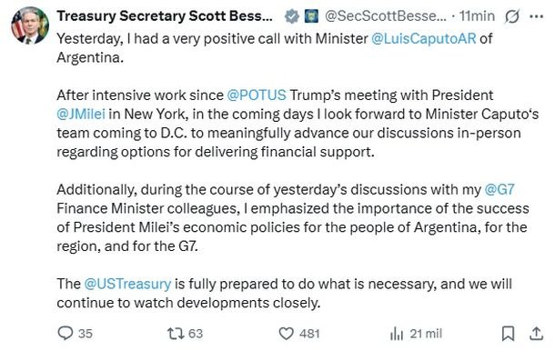 «En los próximos días espero que el equipo del ministro Caputo venga a DC para avanzar significativamente en nuestras discusiones en persona sobre las opciones para brindar apoyo financiero«, informó Bessent tras contar que tuvo «una llamada muy positiva» con el titular del Palacio de Hacienda.