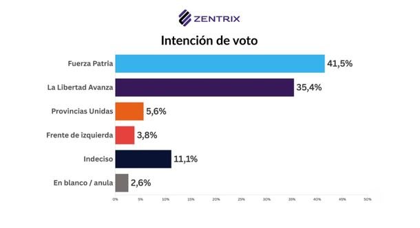 La intención de voto de septiembre muestra un crecimiento significativo de Fuerza Patria, que alcanza el 41,5%, cuando el mes pasado se ubicaba en 36,8%. Por su parte, La Libertad Avanza también sube levemente al 35,4%, frente al 34,5% previo.