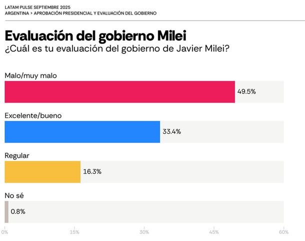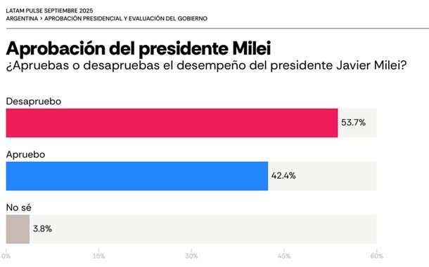 Según el relevamiento de Latam Pulse, de la consultora AtlasIntel, en conjunto con Bloomberg, la desaprobación a la imagen presidencial alcanzó en septiembre el 53,7%, mientras que la aprobación cayó a 42,4%. Algo que hasta hace pocos meses parecía inconcebible, sobre todo para el propio Milei.