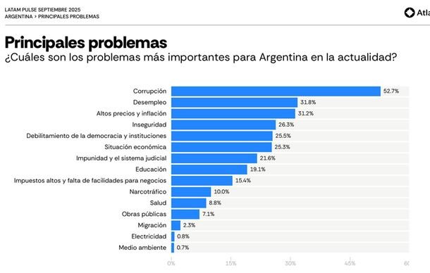 Otros temas preocupantes son la inseguridad, con el 26,3%; el debilitamiento de la democracia y las instituciones (25,5%), la situación económica (25,3%), la impunidad y el sistema judicial (21,6%) y la educación (19,1%).